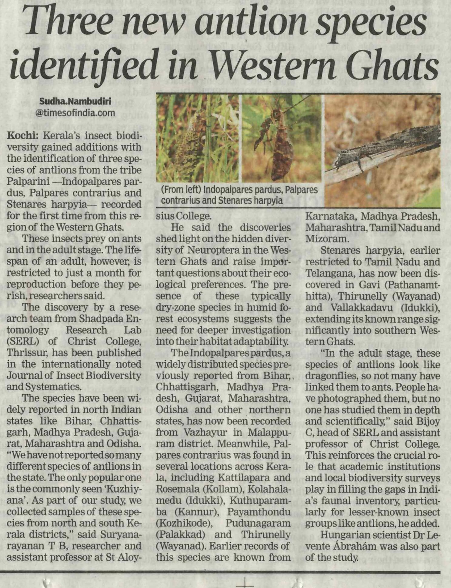 Three new antlion species identified in Western Ghats (Source: Times Of India 11.08.2025)
