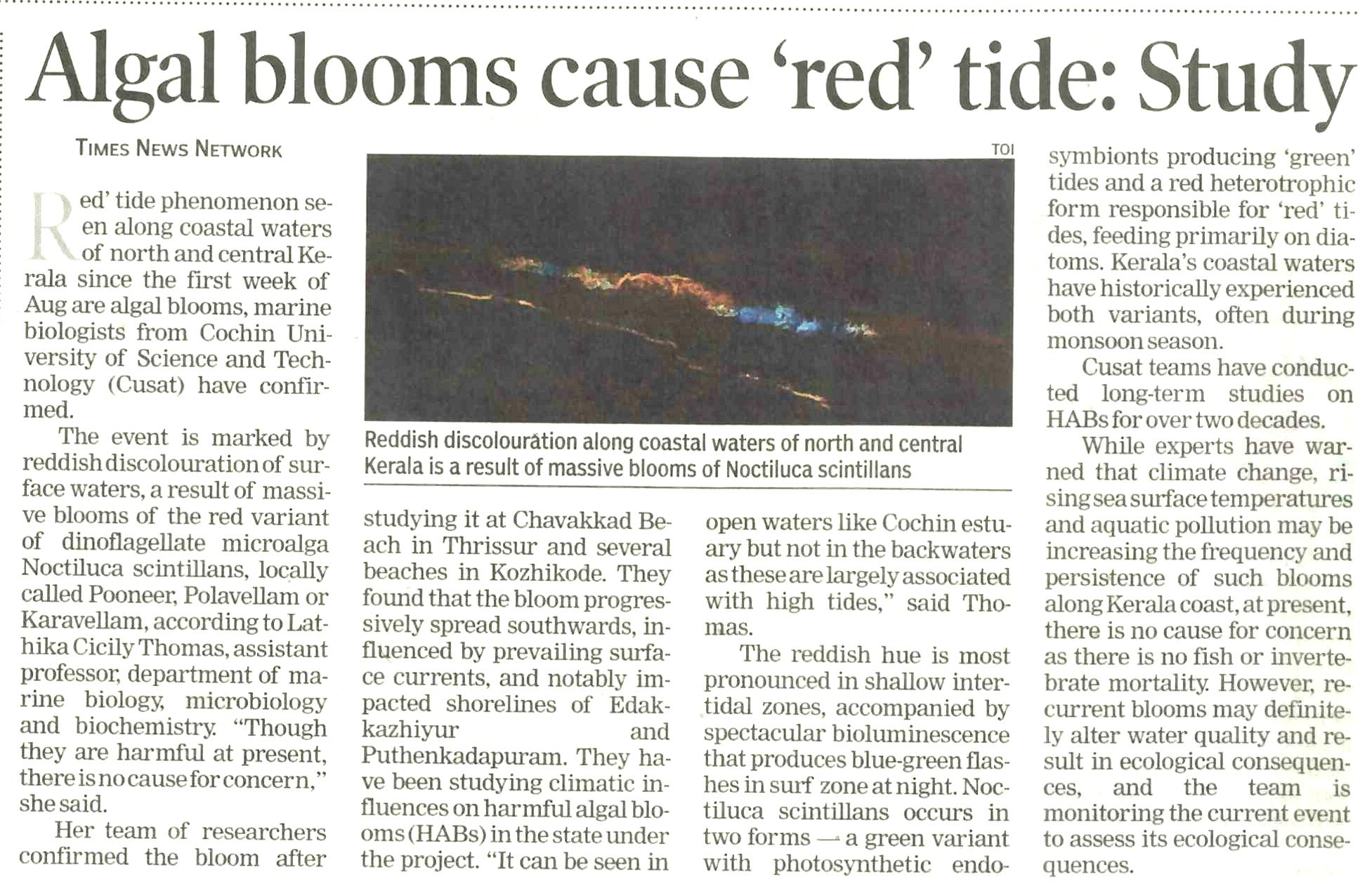 Algal blooms cause 'red' tide: Study (Source: Times Of India 14.08.2025)