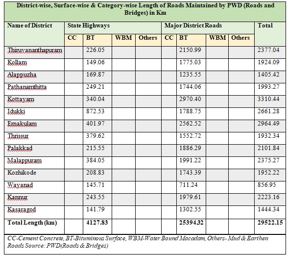The major roads in the State are developed and maintained by the State Public Works Department. The total length of roads maintained by Public Works Department (PWD)-Roads and Bridges (R&B) is 29,522.15km in 2021-22, which comprises 4,127.80km (13.98 per cent) State Highways and 25,394.32km (86.01 per cent) Major District Roads (MDRs).Out of the total length of the State Highways, 898.74km is four lanes, 3,193.50km is two lanes and remaining 35.75km is single lane roads. The Major District Roads covers 25,394.32km of roads with 52.51km four lane. The Local Self Government Department (LSGD) own and operates 83.19 per cent of the total road network in the State whereas the PWD (R&B) maintains 12.78 per cent of roads. The PWD (NH) wing upkeeps 0.23 per cent of the total length of road in the State and the remaining 3.8 per cent of roads are called other roads which are maintained by Railways, Irrigation, KSEB, Forest and Dewasom departments.