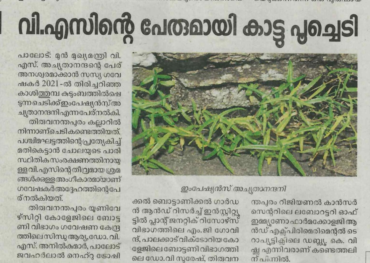 വി.എസിന്റെ പേരുമായി കാട്ടു പൂച്ചെടി (Source: Kerala Kaumudi 02.08.2025)