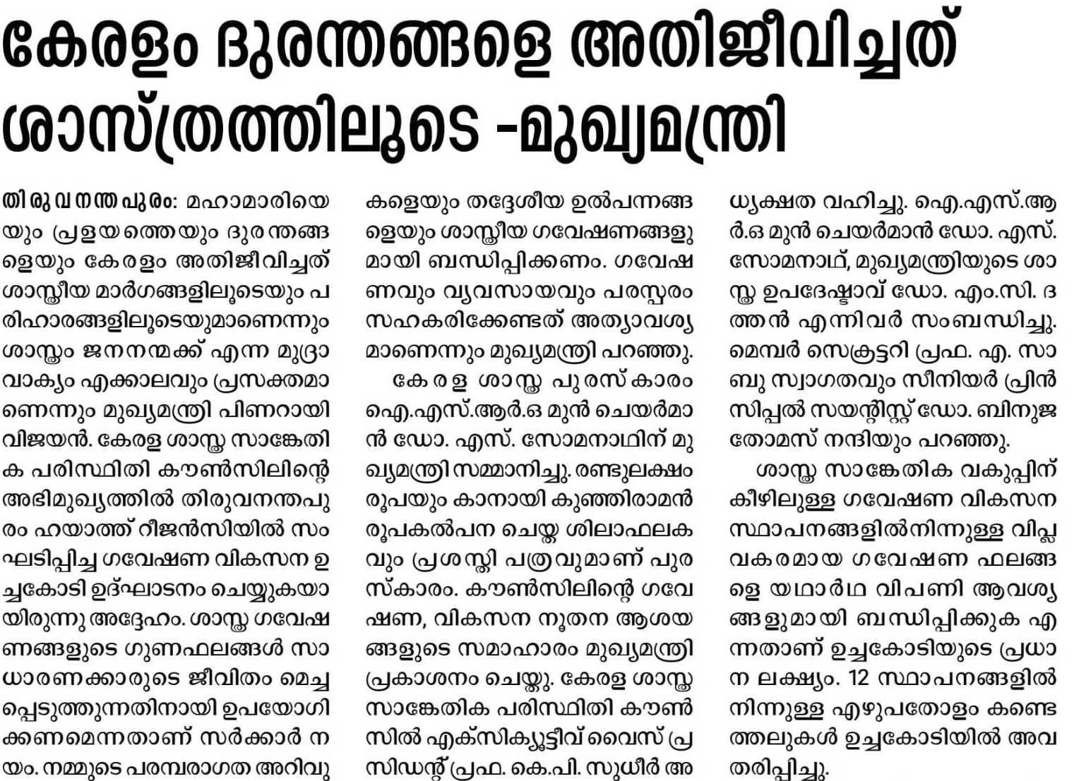 കേരളം ദുരന്തങ്ങളെ അതിജീവിച്ചത് ശാസ്ത്രത്തിലൂടെ -മുഖ്യമന്ത്രി (Source: Madhyamam 08.08.2025)